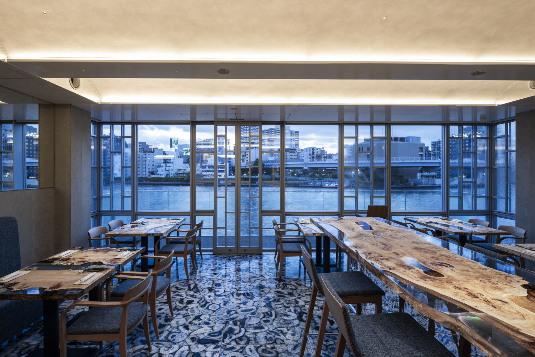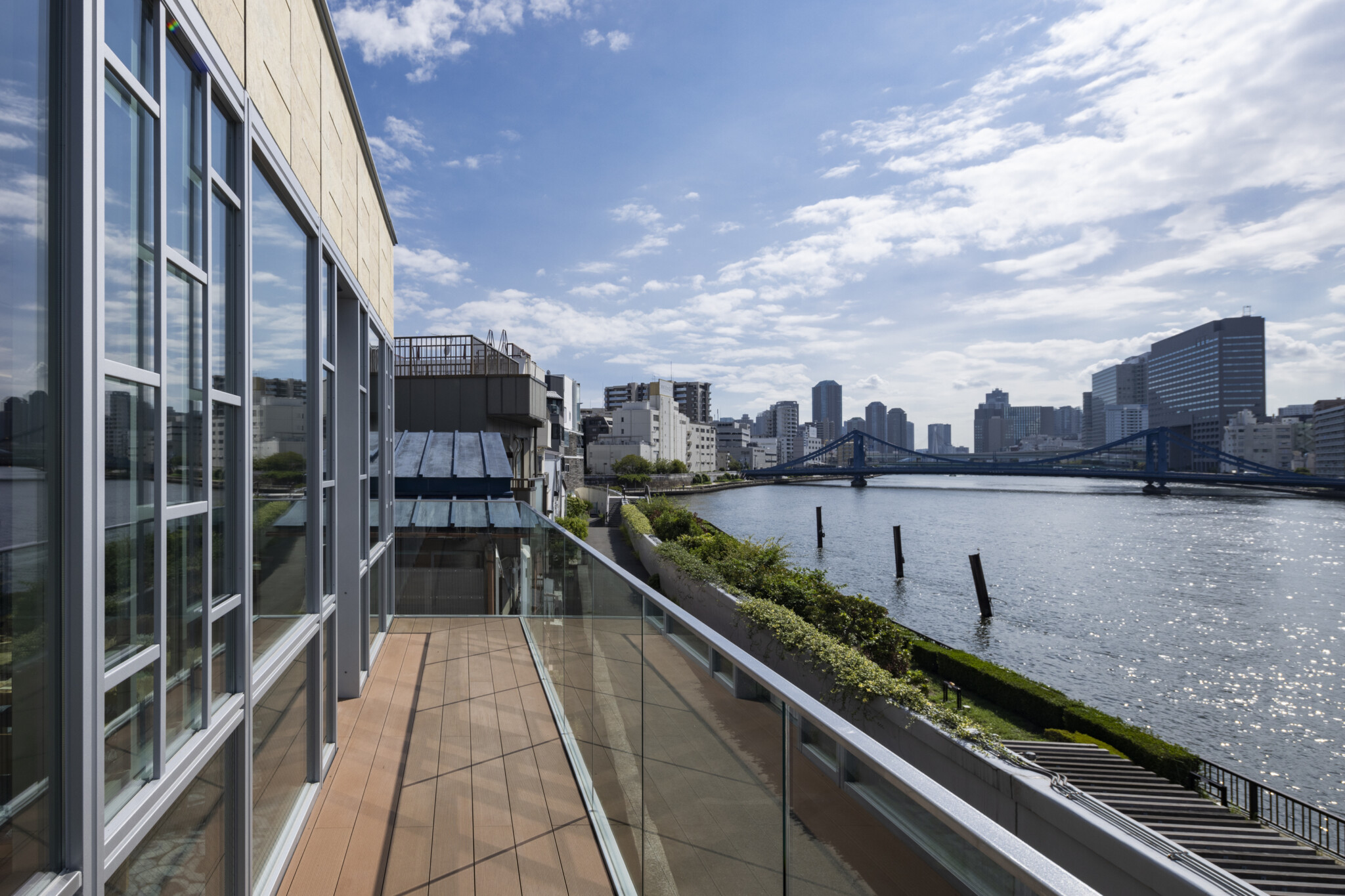 江東区常盤の隅田川沿いに建つ、約400 m2 の商業施設。