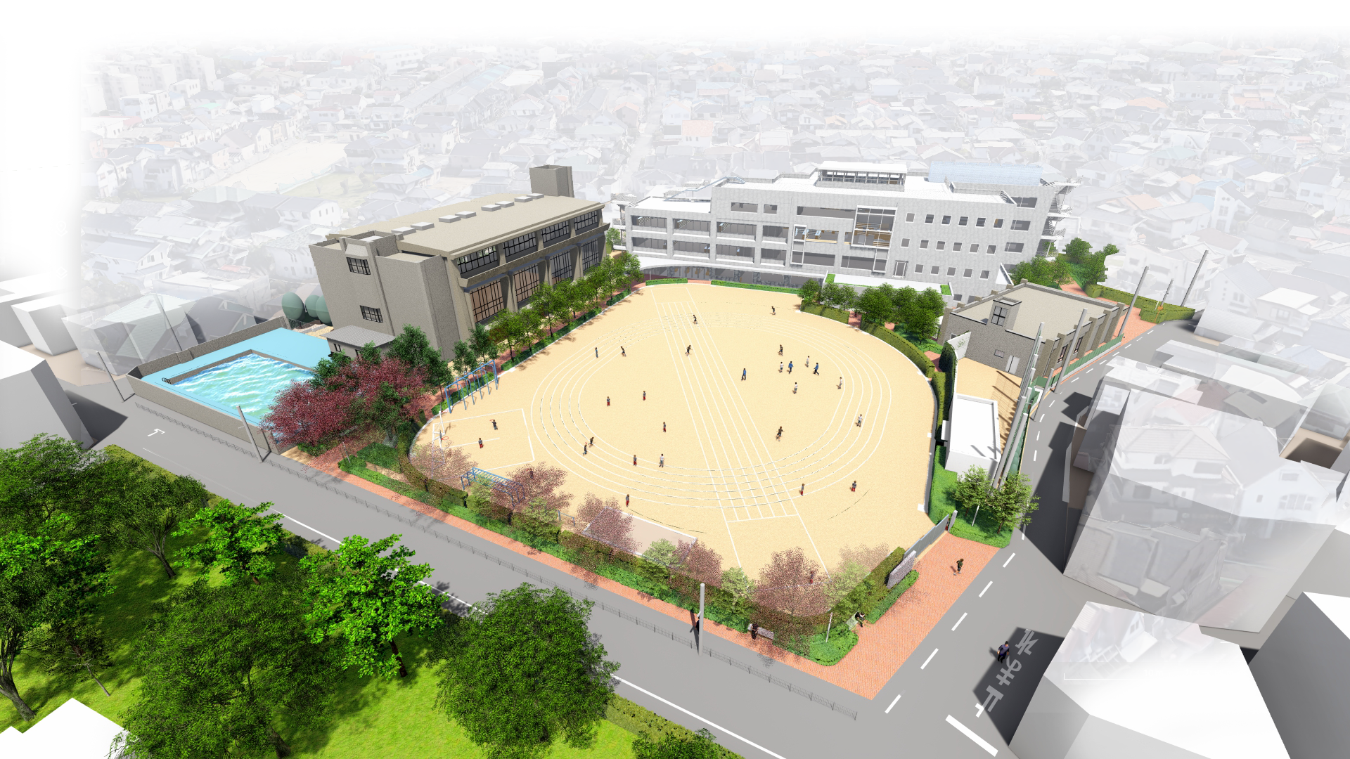 現状、堺市内で最も校庭が狭い小学校となっており、校庭の拡大が地域の悲願となっていた。また、海岸から比較的近く標高も低いため、想定最大規模の南海トラフ地震時には浸水のリスクがある地域であるが、周辺は低層住宅が中心で避難先が限られる状況であった。そのため、想定最大浸水レベルを超える高さに最大限に室を配置でき、校庭を最大限確保できる4階建ての校舎が地域住民の強い要望であった。