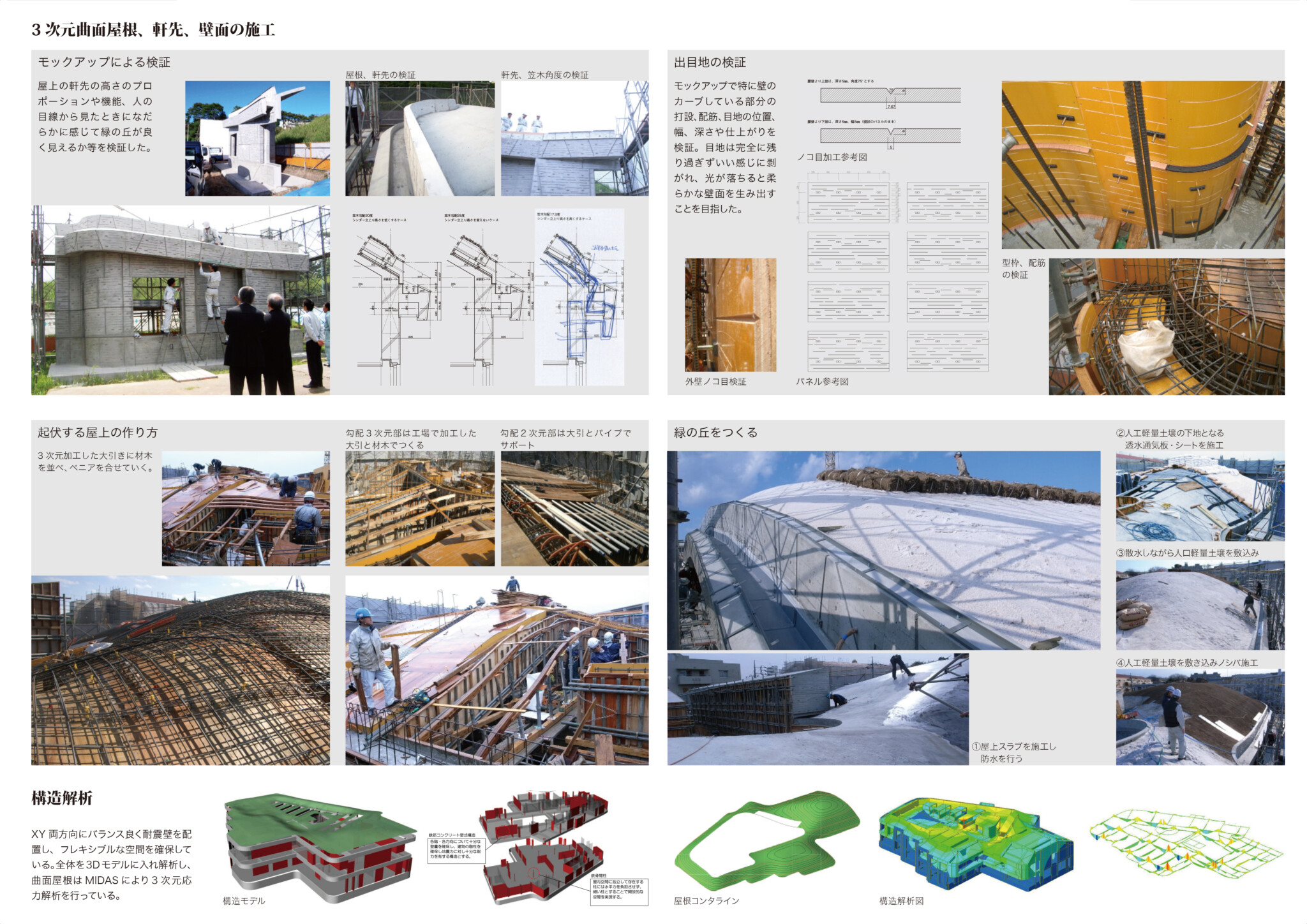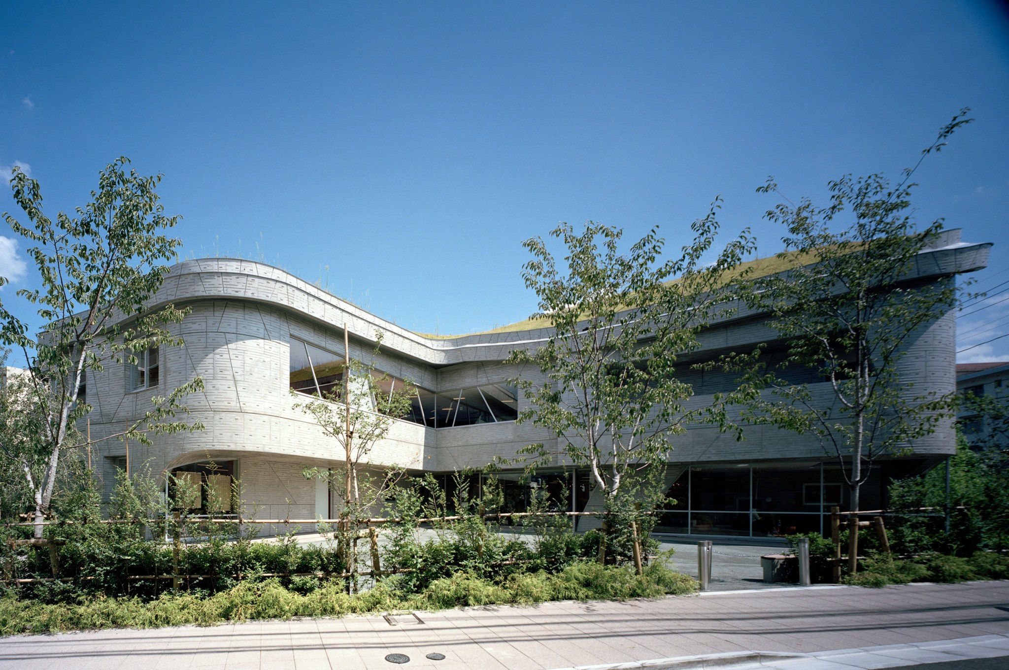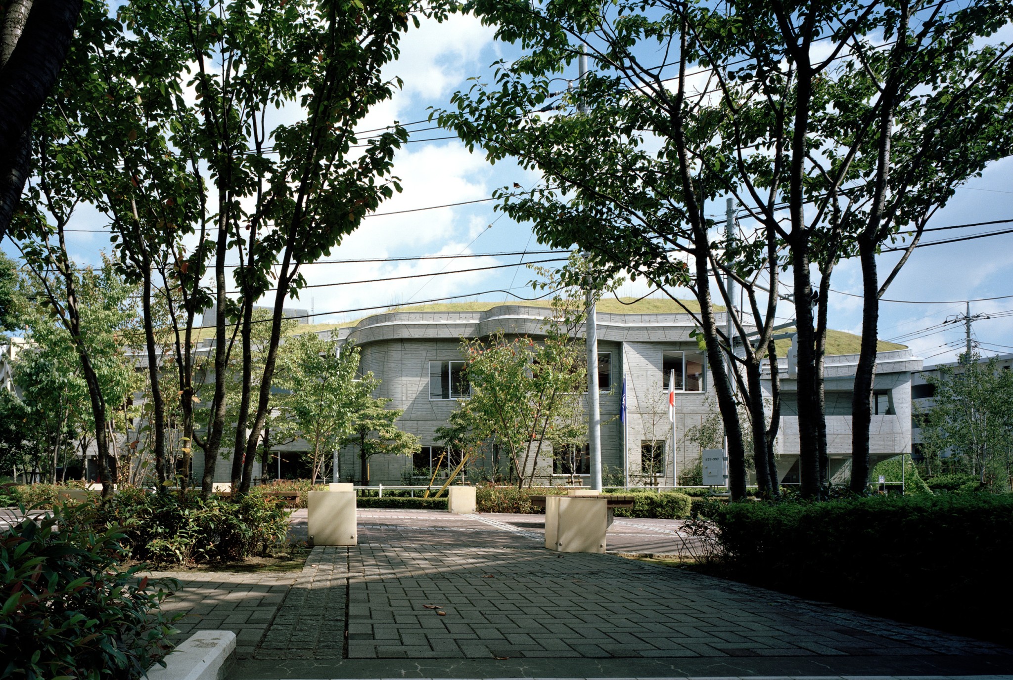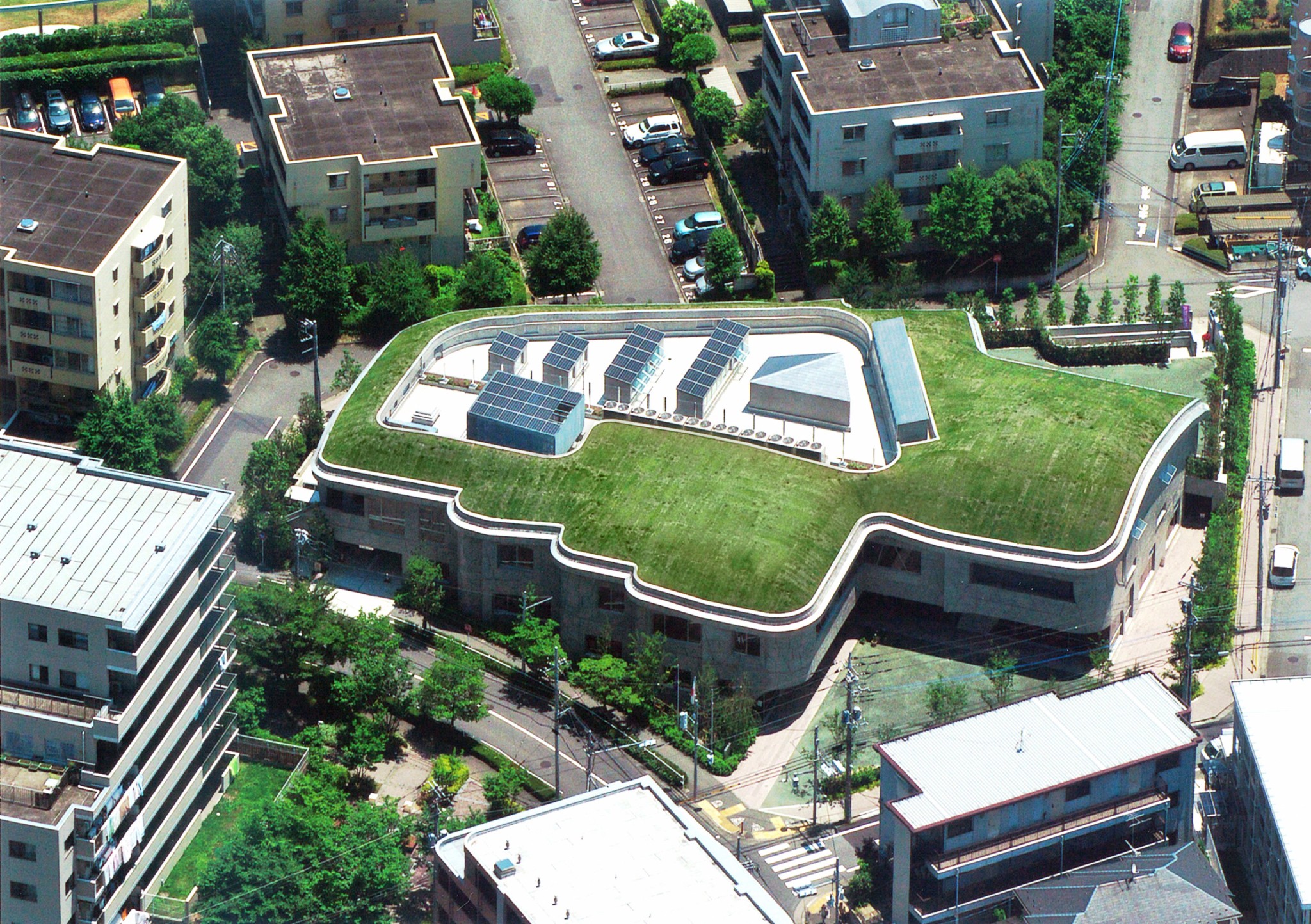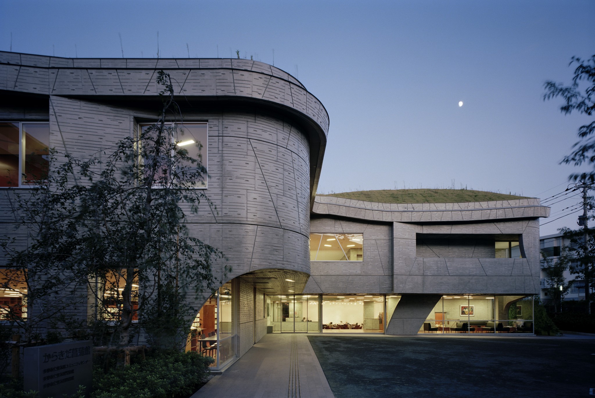 敷地は小さな丘であった。その丘で遊んで育った人々の記憶を建築として再構築した。敷地の周囲を巡る約一層分の高低差を利用し、西側=前面道路側を二層、東側を一層として、図書館やコミュニティセンターのメインエントランスを西側に、児童館の入口を東側にすること、また建物の周囲に今までなかった歩道や植栽を巡らし、建物の屋根を起伏のついた緑化で覆い、その土地の記憶を蘇らせるようにした。