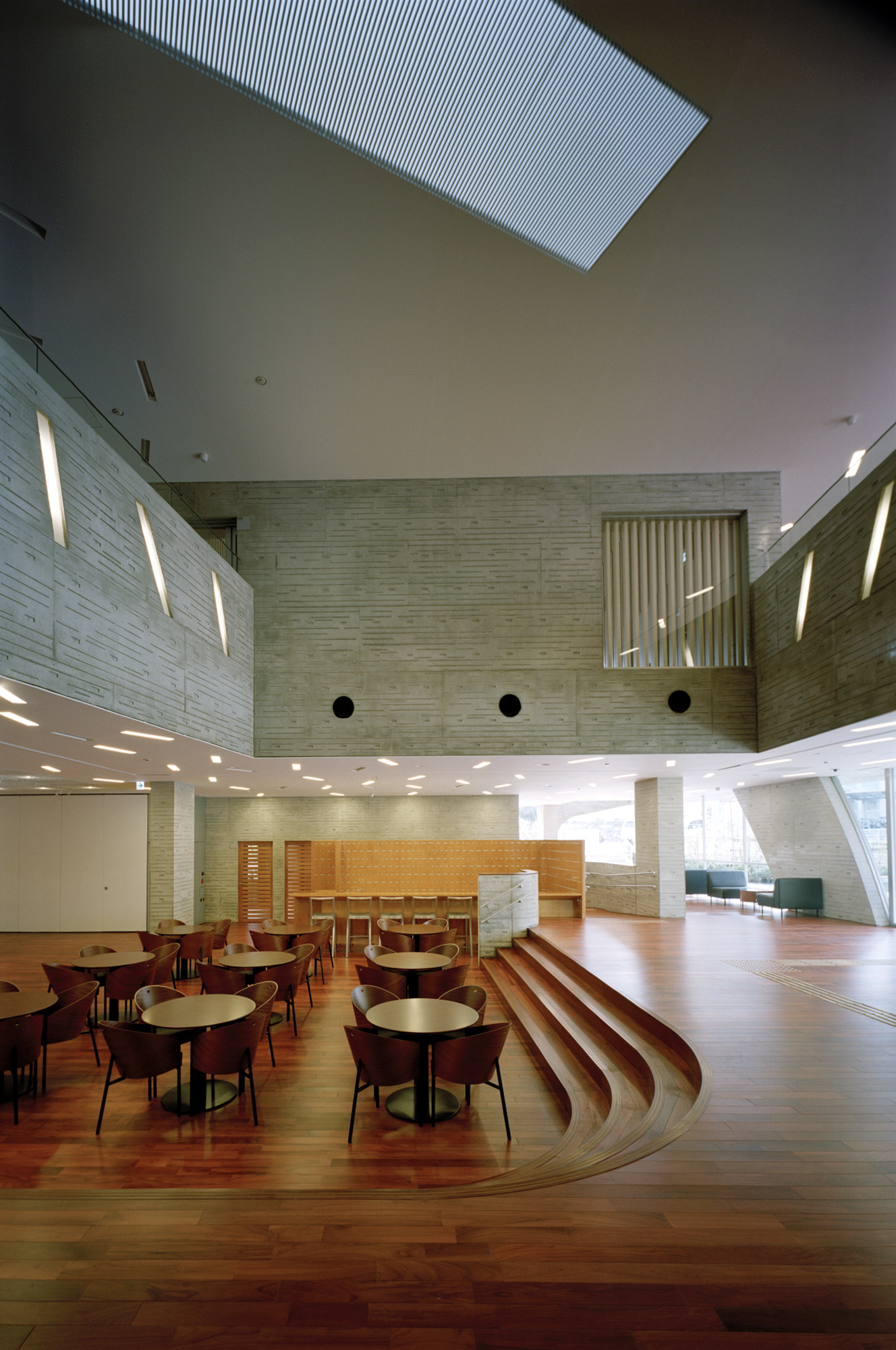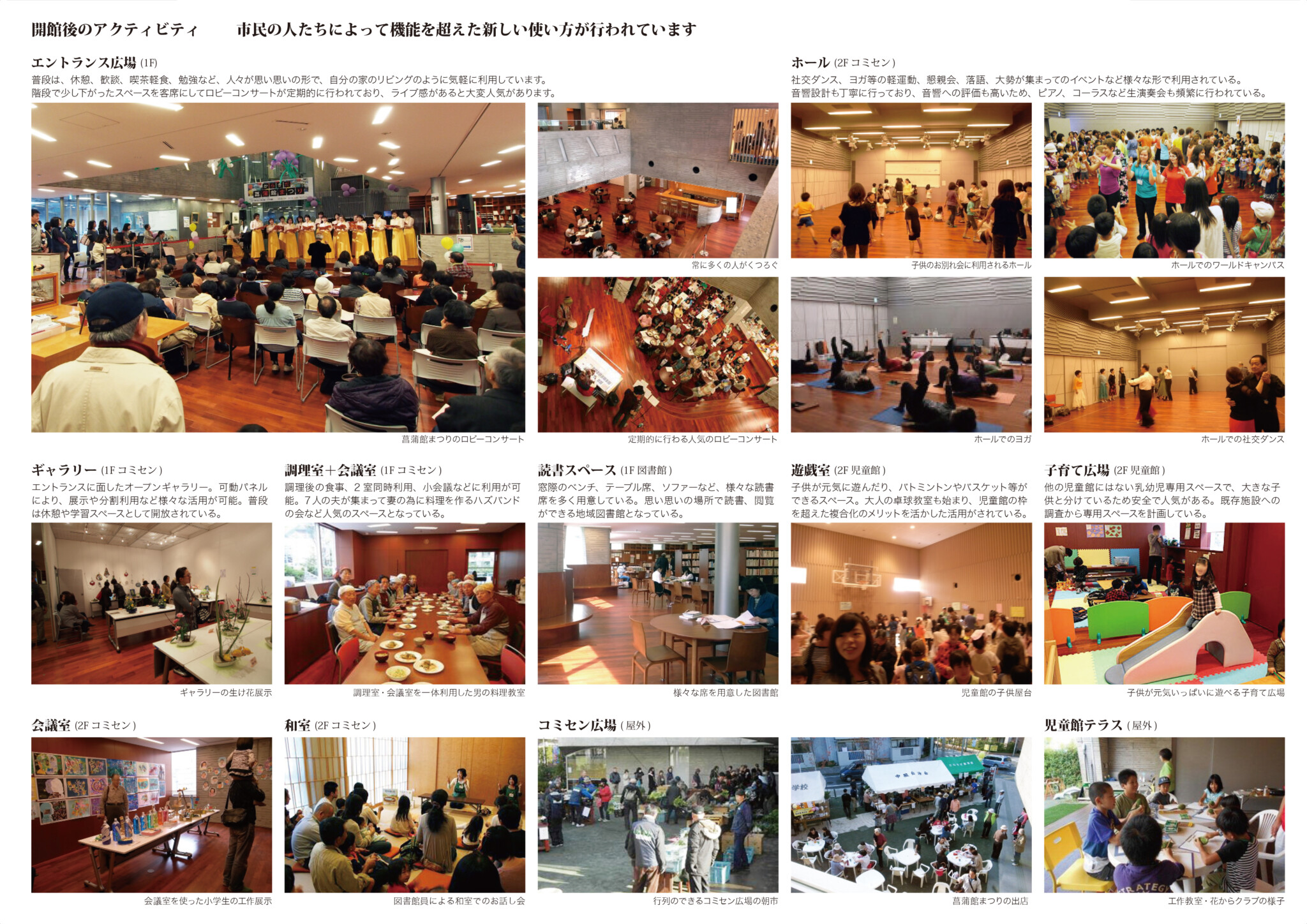 当初、市は別の設計者と計画を進めていたが、住民の合意を得られず停滞した。そして話し合いの結果、市は再度、案を公募することとし、プロポーザルは、3階建の旧案の修正案を求めるという趣旨で行われた。私達は地形を活かした2階建のユニバーサルデザインの建物を提案した。審査は住民公開で行われ、私達が選定された。開館後は足の踏み場もないほど賑わっている。
