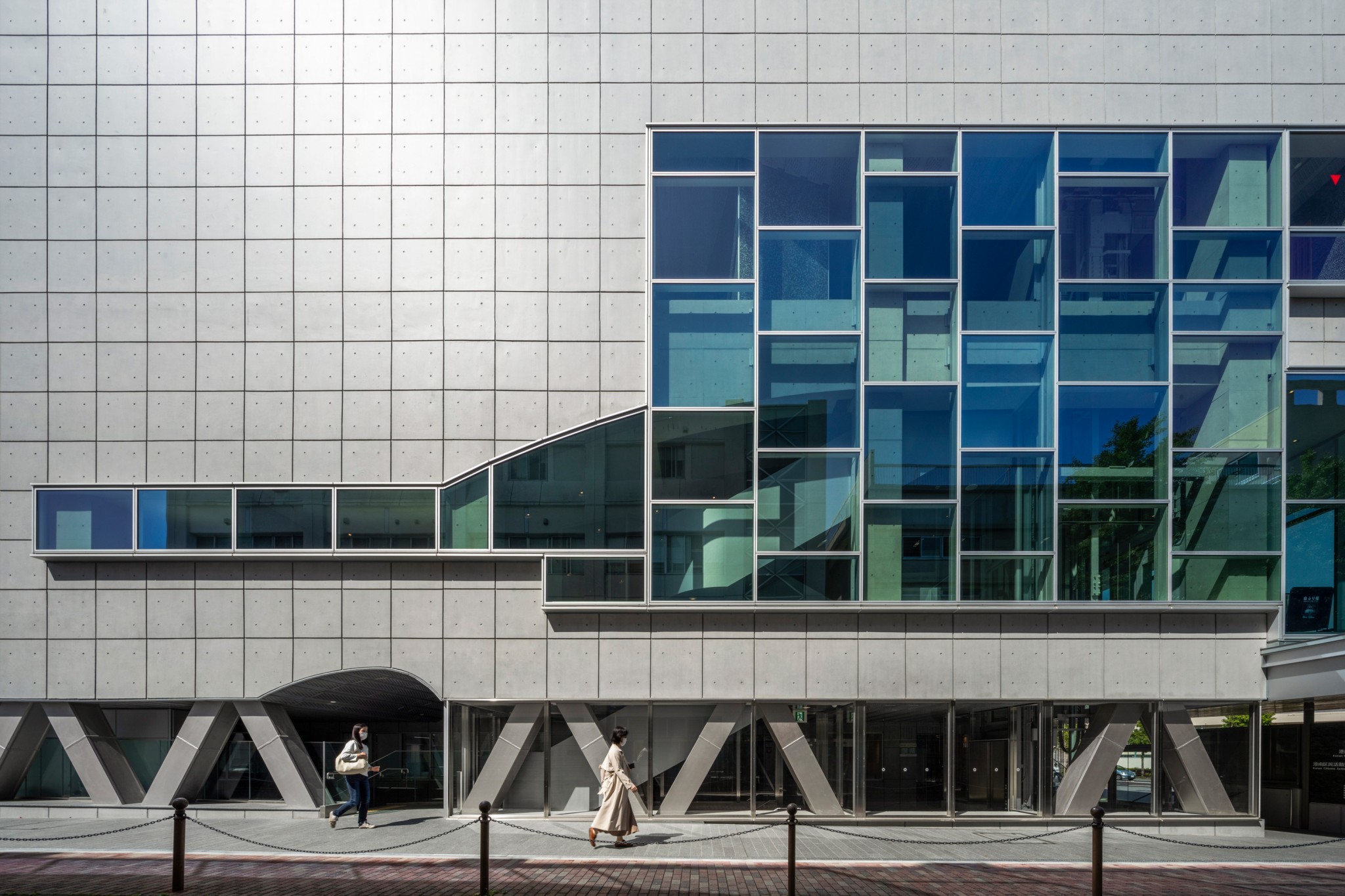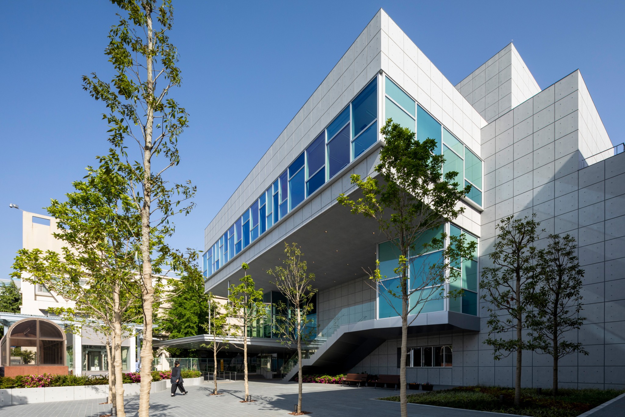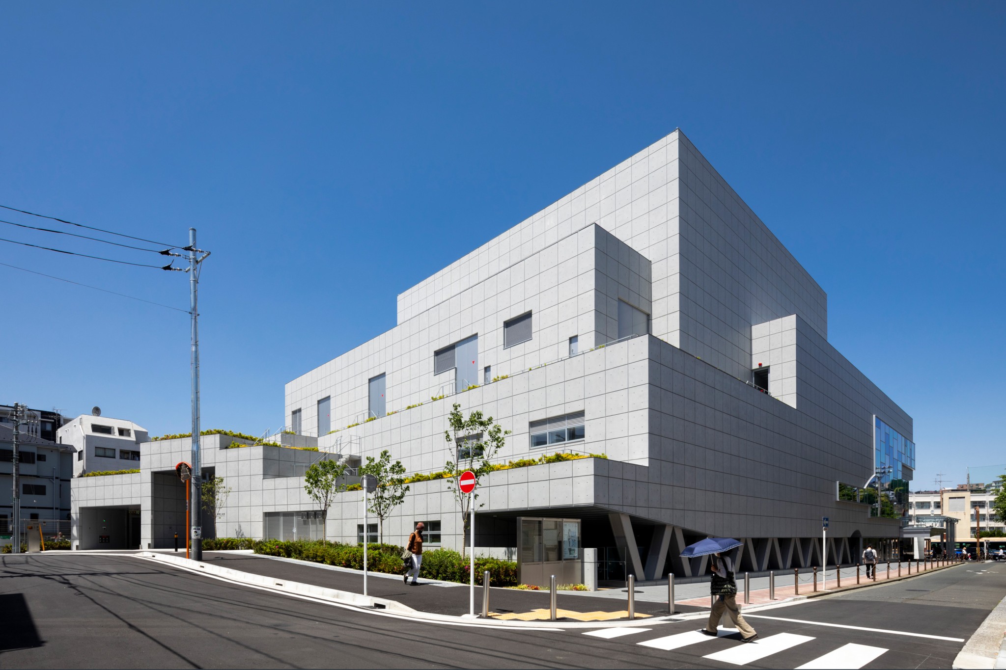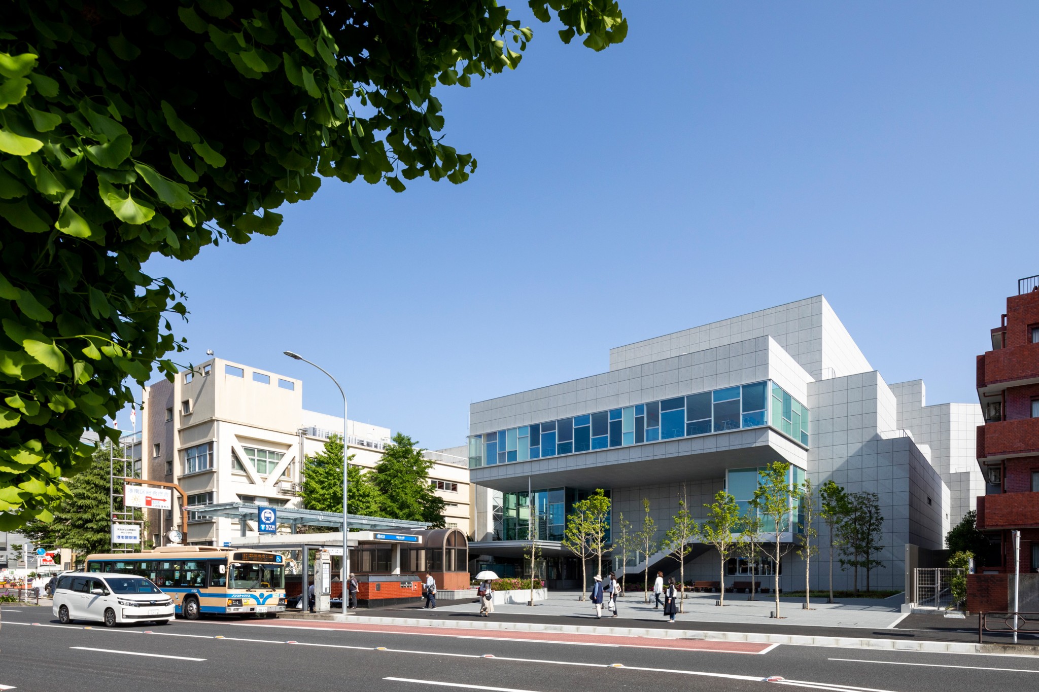 公会堂、土木事務所、区民活動支援センターからなる複合施設である。既存建物の地下躯体を山留めとして再利用し、その内側におさまる平面を計画とする必要があった。断面的には、道路斜線と地区計画規制をクリアし、隣接する住宅地への影響を最小限にするため、段々状にセットバックする形態とした。このように平面、断面ともに非常に厳しい形態制限のなかで、コンパクトに各施設をまとめる必要があった。さらに隣接する地下鉄駅舎への影響を最小限とするため、地下躯体は鎌倉街道から大きく離し、かわりに上部躯体をSRC造として約8mオーバーハングさせた。これにより必要諸室の面積を確保すると同時に、駅前広場に大きな軒下空間が生まれた。地上には24時間自由に通行できる遊歩道をもうけ、駅から区役所を結ぶ歩行者空間を生み出した。また鎌倉街道に面して約500 m2 の駅前広場をつくることで、開かれた市民のための憩いの場が生まれた。