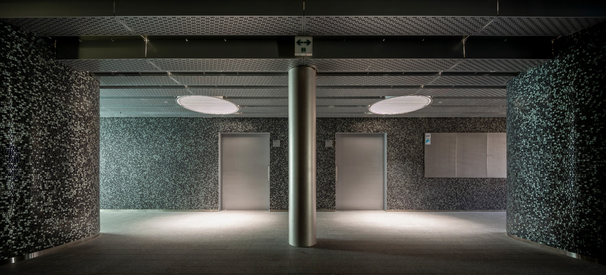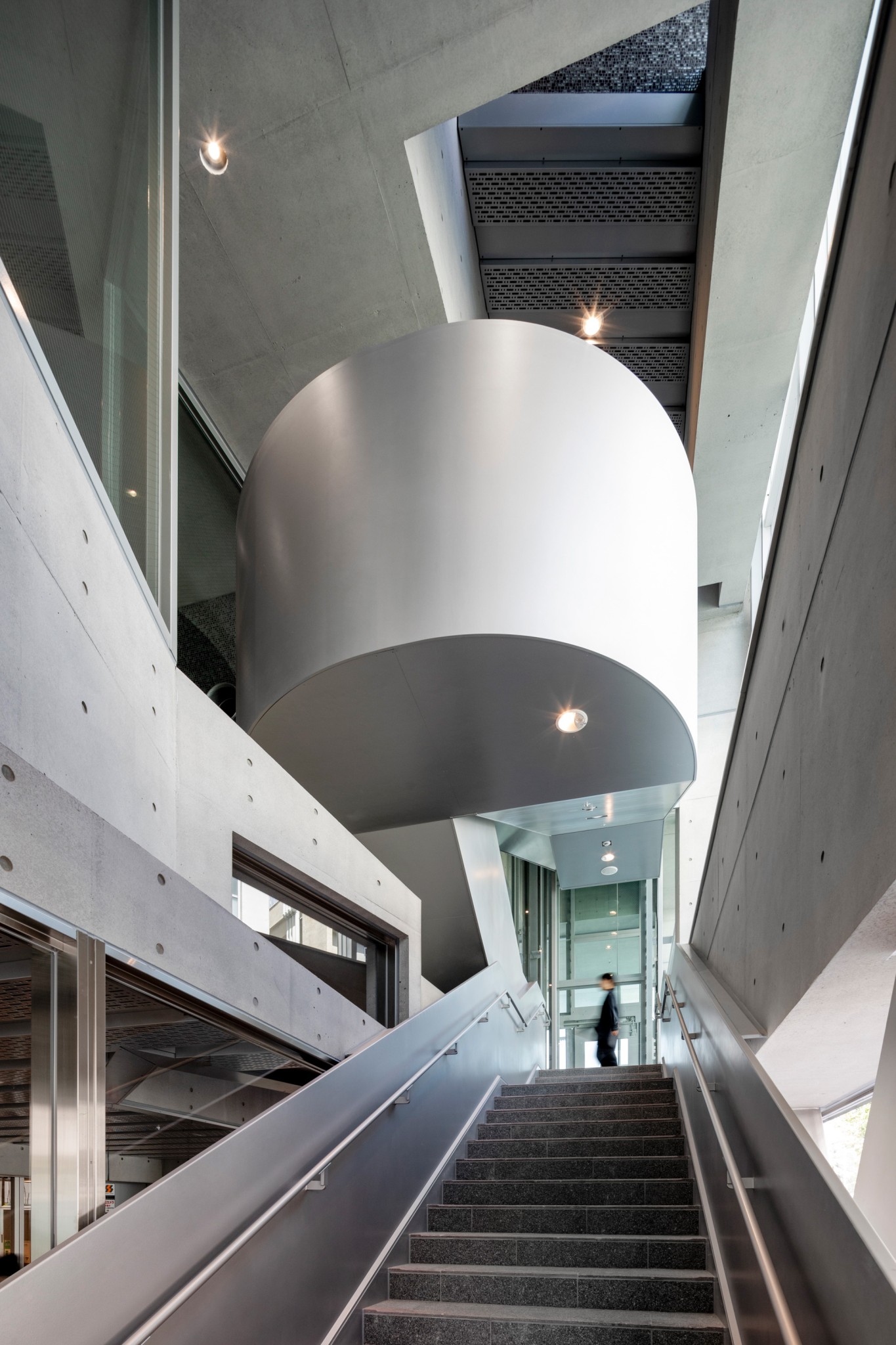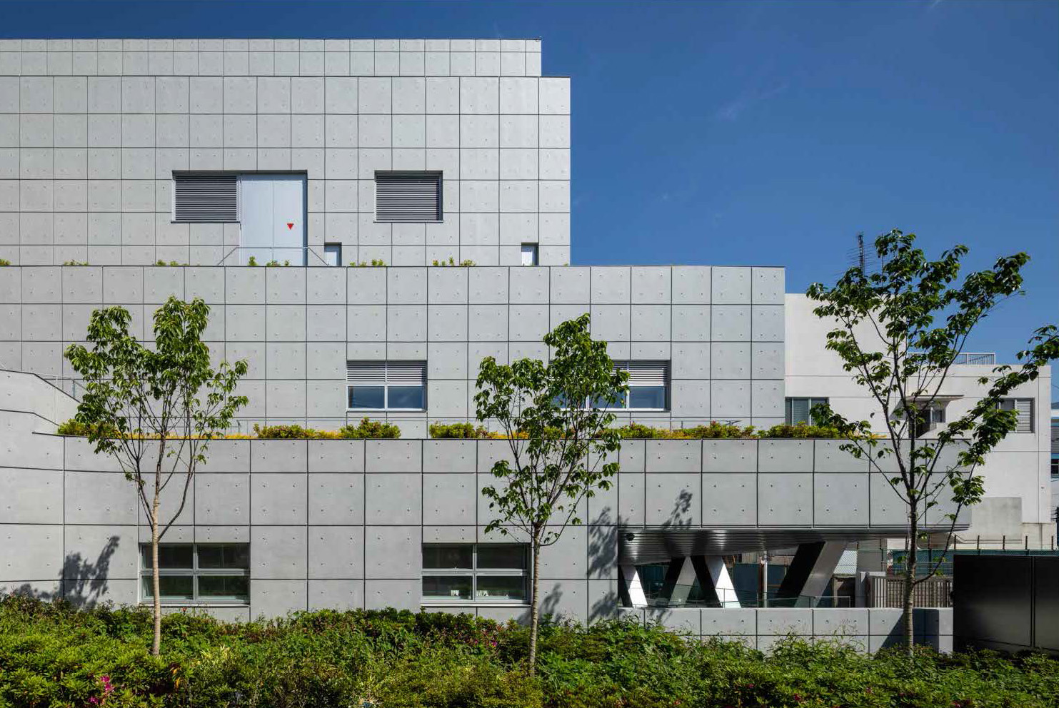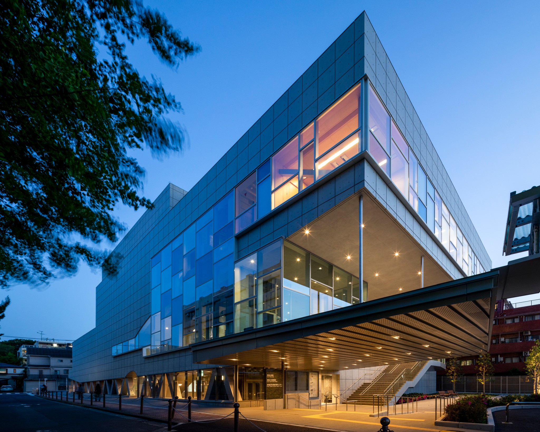 公会堂、土木事務所、区民活動支援センターからなる複合施設である。既存建物の地下躯体を山留めとして再利用し、その内側におさまる平面を計画とする必要があった。断面的には、道路斜線と地区計画規制をクリアし、隣接する住宅地への影響を最小限にするため、段々状にセットバックする形態とした。このように平面、断面ともに非常に厳しい形態制限のなかで、コンパクトに各施設をまとめる必要があった。さらに隣接する地下鉄駅舎への影響を最小限とするため、地下躯体は鎌倉街道から大きく離し、かわりに上部躯体をSRC造として約8mオーバーハングさせた。これにより必要諸室の面積を確保すると同時に、駅前広場に大きな軒下空間が生まれた。地上には24時間自由に通行できる遊歩道をもうけ、駅から区役所を結ぶ歩行者空間を生み出した。また鎌倉街道に面して約500 m2 の駅前広場をつくることで、開かれた市民のための憩いの場が生まれた。