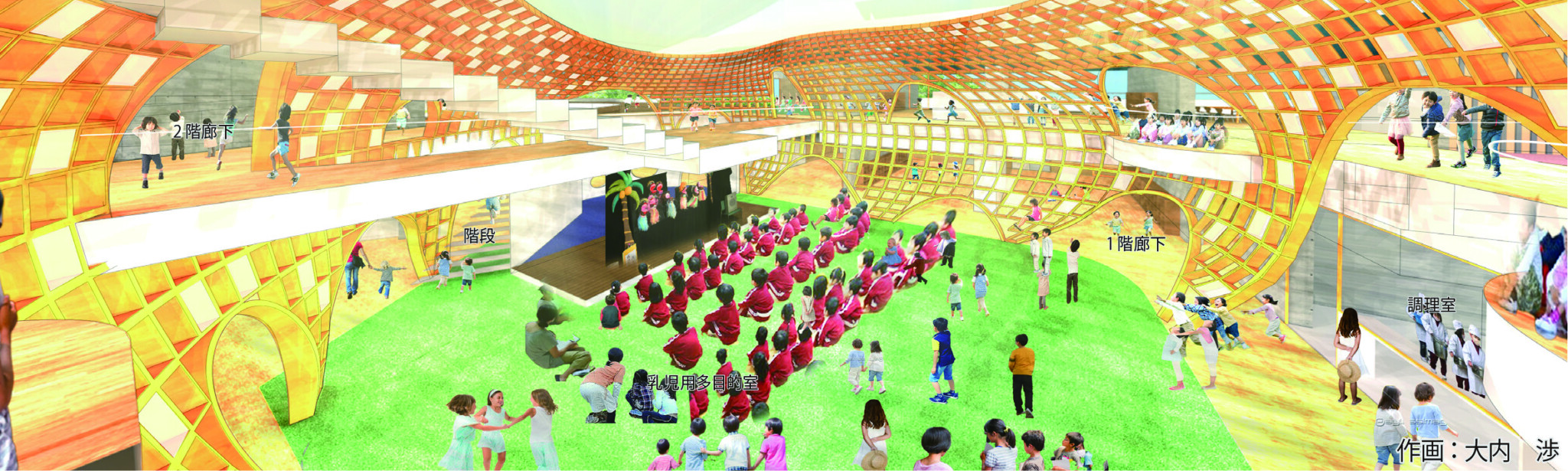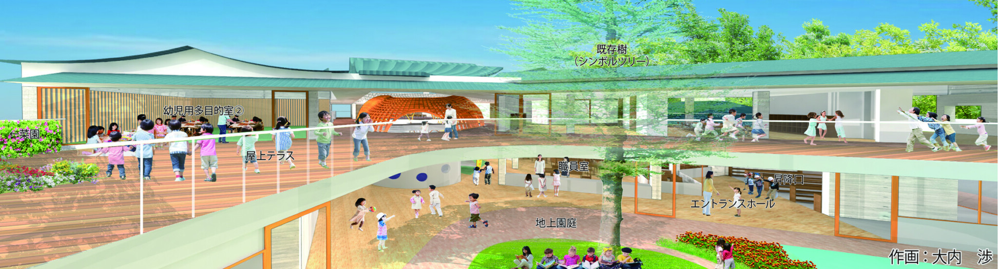 立体的に広がり、施設自体が木育・食育を含めたさまざまな学びを提供する保育所を目指します