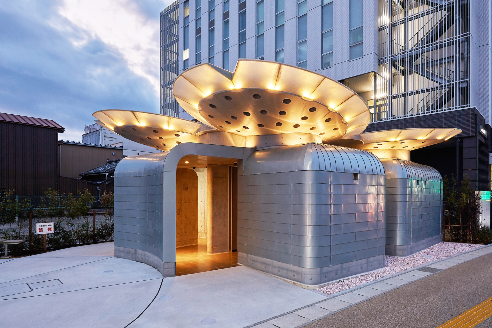 上野東町ポケットパーク Pocket Park松尾芭蕉の詠んだ「さまざまの事おもひ出す桜かな」に呼応し、街角・そして歴史的街並に対してインパクトのあるポケットパーク、LGBTへの配慮を行いました。 石の庭、芭蕉が歩いて来た世界、石碑、屋根は彼の被っていた”みのかさ”、桜をイメージし、さらに木格子と緑が隣接の建物との境界となるように、そんな事をイメージしました。 Location 三重Status 竣工Area 67m2Floors 公園面積 341 m2 Year 2020年Architect 新居 千秋